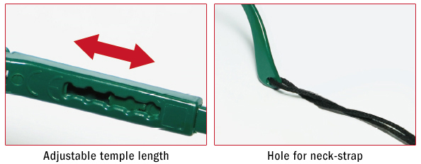 • 4-position temple length adjustment and hole for neck-strap.